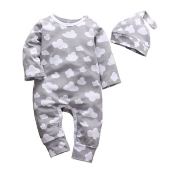 Baby Romper Cloudy met mouwen en mutsje (2- delig). De romper heeft drukknopjes bij de schouder en bij de benen. Leuke grijze romper met witte wolkjes. Gemaakt van 100% katoen.
