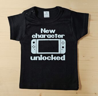 Baby T-Shirt met korte mouwen in de kleur zwart. Het shirt heeft het design New character unlocked. Het materiaal is super zacht en van goede kwaliteit.