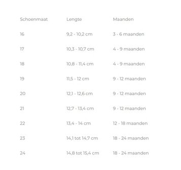 Beschikbaar in maten 18 tot en met 23, deze sneakers passen perfect bij baby's en peuters van 9 tot 24 maanden. De maatopties zorgen ervoor dat je een paar kunt kiezen dat comfortabel past bij je groeiende kind. Let op deze schoenen vallen groot uit!
